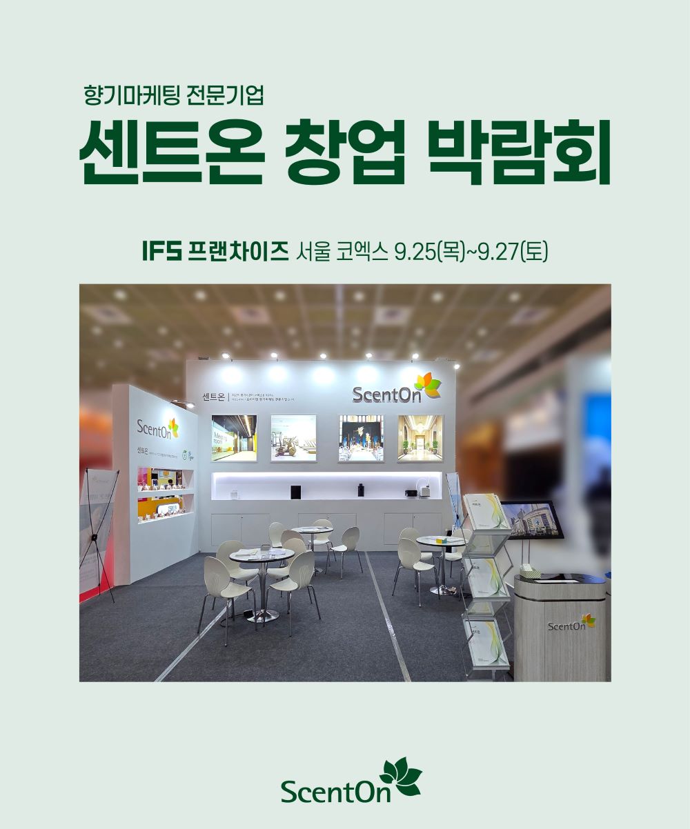 프리미엄 향기마케팅 전문기업 센트온(ScentOn, 대표 유정연)이 오는 9월 25일(목)부터 27일(토)까지 3일간 서울 삼성동 코엑스(COEX) C·D홀 전시장 전관에서 열리는 ‘2025 하반기 제29회 IFS 프랜차이즈 창업·산업 박람회’에 참가한다고 22일 밝혔다.